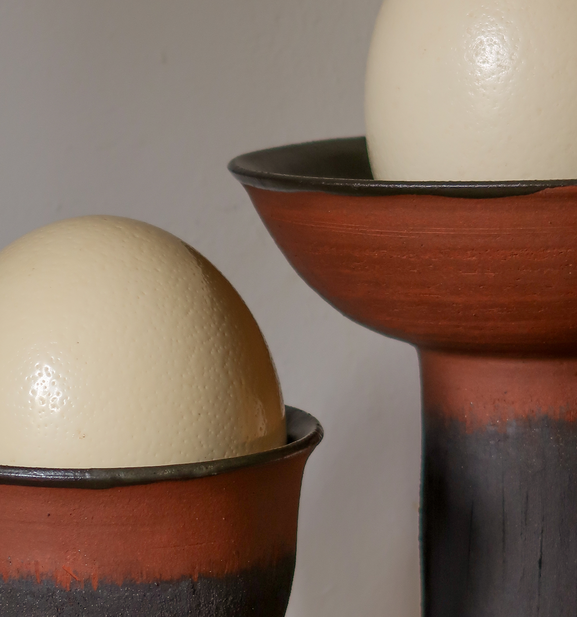 ANDREA TSANG and MATERIAL LIGHTS unveil their collaborative series transforming ostrich eggs and ceramic into luminous art. Beginning with materials from the earth, they craft fixtures that blur boundaries between nature and design. Warm light filtering through translucent eggshell—like a rising moon—dances across ceramic forms, shifting tones and bringing each piece to life. The series features EGG wall lamps in various matte glazes reminiscent of natural eggshells, alongside three sculptural table lamps in an installation ‘Born/Reborn’ showing at Stockholm Creative Edition.
