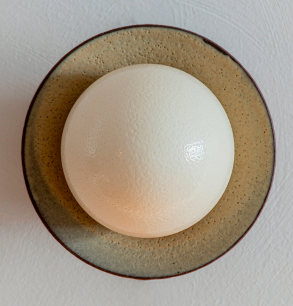 “Our collaboration began with a shared reverence for raw, natural materials and their quiet beauty. Together, we explored how light transforms when meeting these elements—how an eggshell’s translucence or a ceramic surface can glow, shift, and breathe. The result is our EGG Collection: wall and table lamps where warm light filters through carefully crafted forms, their matte textures evoking the gentle, diffused glow of moonrise on the horizon.”