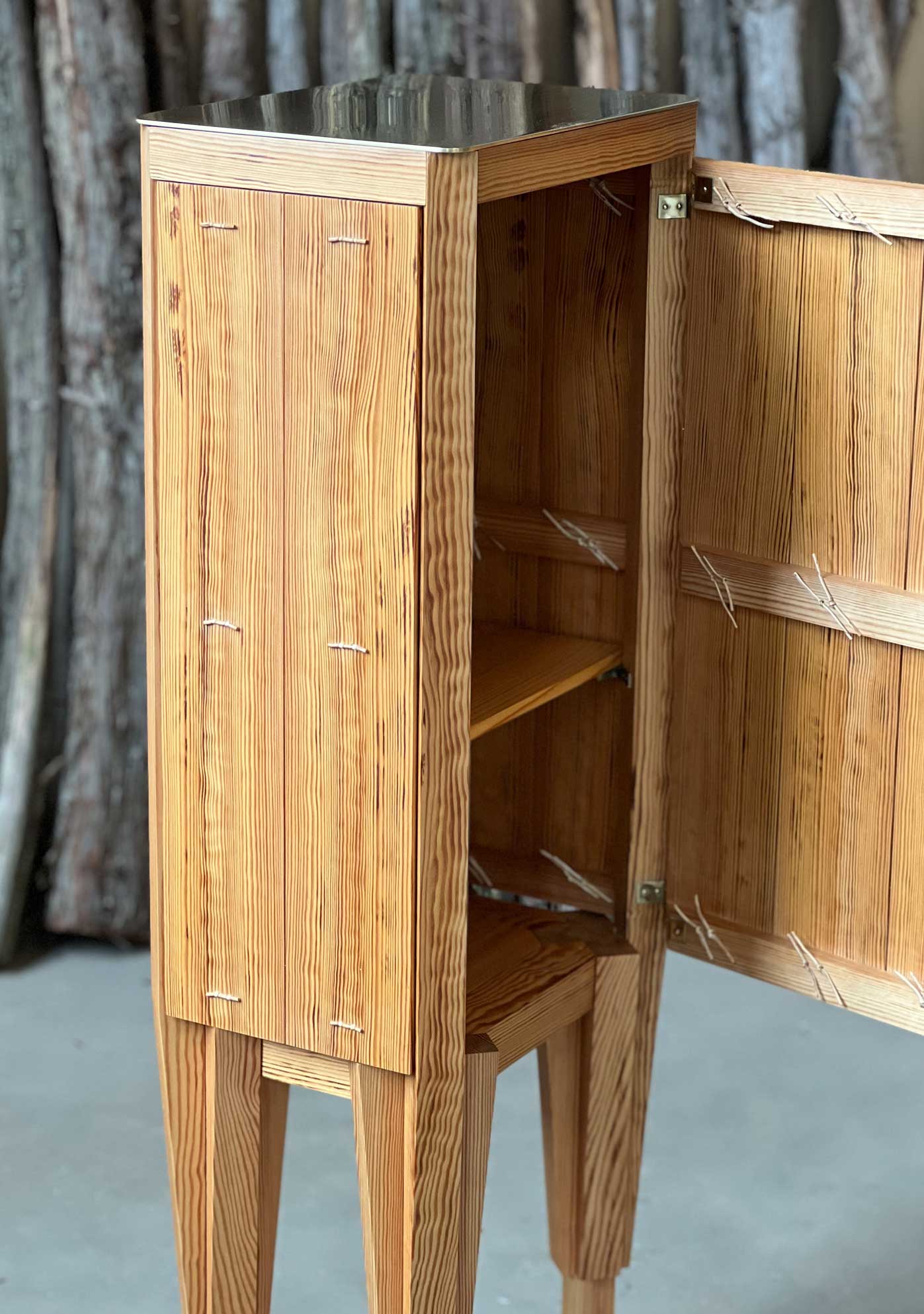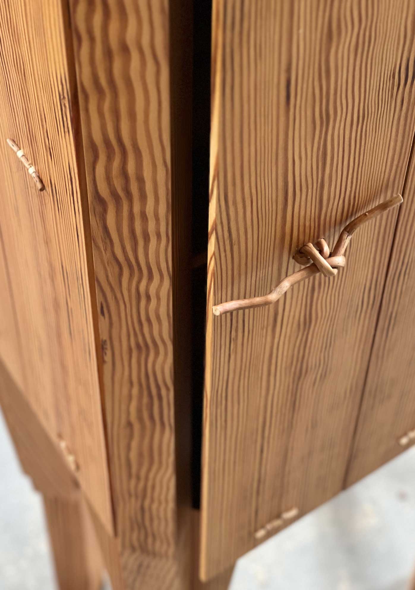 Ekeskog is a cabinet made from reclaimed pine salvaged from the nearly 800-year-old church bell tower in Ekeskog, Västergötland. Constructed entirely without glue, the piece relies on dovetail joints, locking tenons, and traditional spruce-root stitching. The roots are foraged by hand and used fresh, allowing them to be sewn through the wood before stiffening as they dry — a process that binds material, time, and technique.